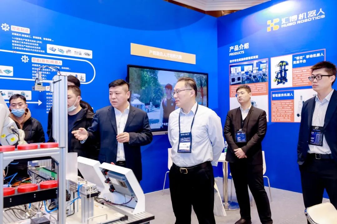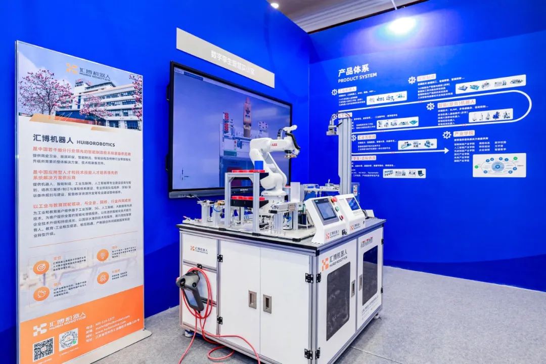 展会现场,汇博机器人围绕“汇博智能制造教育装备”、“产教融合人才培养方案”、“数字孪生智慧实训室”三大模块展示教育数字化创新探索与应用实践。
