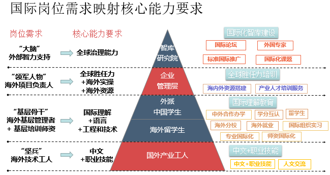 根据国际岗位需求映射核心能力需求,以国际化智库建设为智力支持,为海外项目领军人物提供全球胜任力培训;为留学生提供海外实习就业、师资国际化等国际理解教育;为海外产业工人提供“中文+职业技能”培训。
