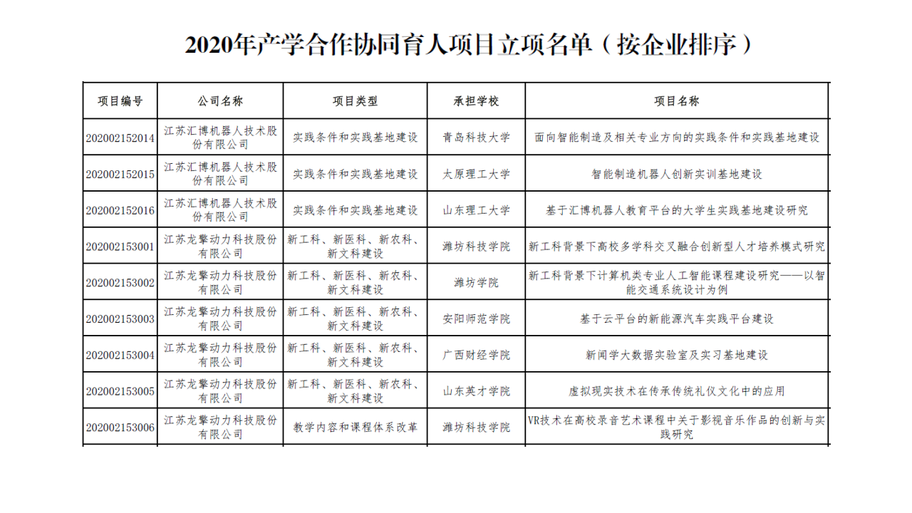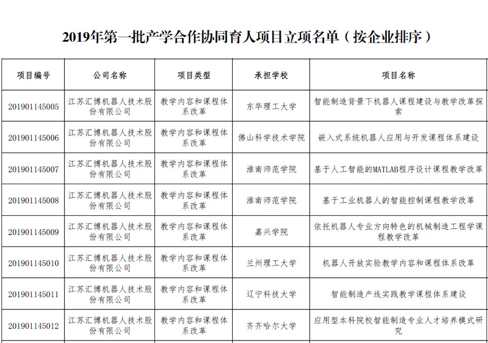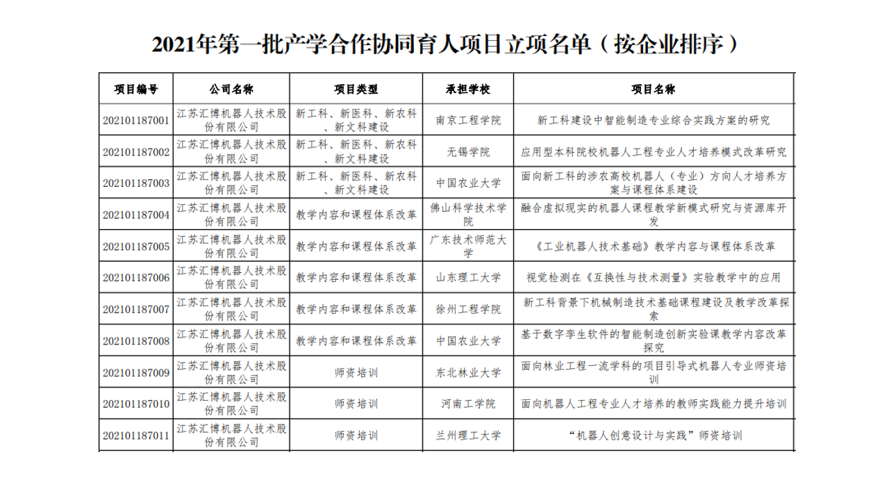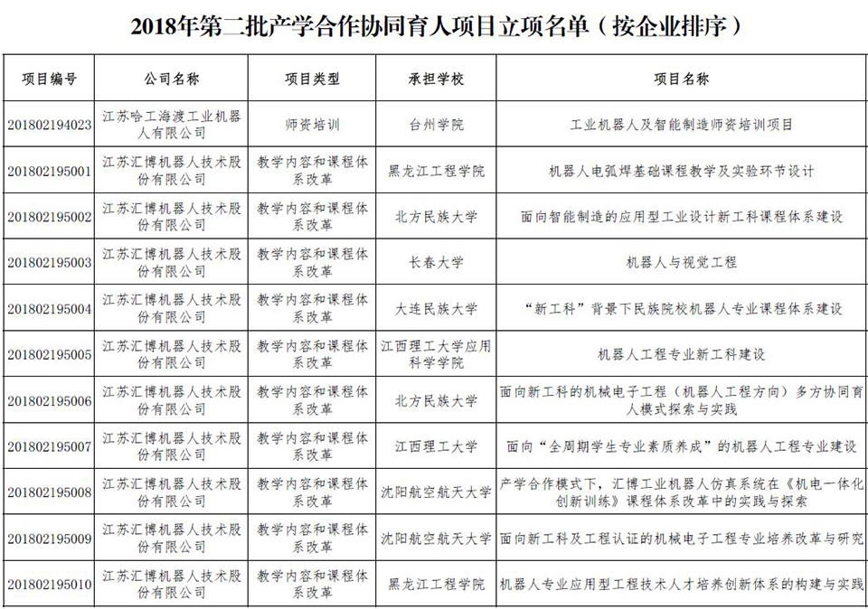 汇博机器人2018年起参与教育部产学合作协同育人项目,汇博为四批产学合作协同育人项目共投入资金212万元,项目内容涉及师资培训、实践条件与实践基地建设、新工科建设、教学内容与课程体系改革等。
